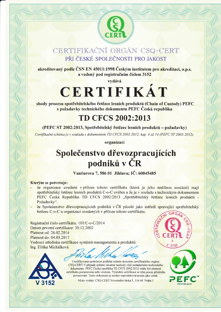 Una fonte controversa è una fonte di materia prima che proviene da disboscamento illegale, come il disboscamento in aree forestali in cui il disboscamento è severamente vietato o in cui è previsto un divieto legale di disboscamento. La materia prima non è gravata da alcun vincolo o diritto di terzi ed è stata estratta e ottenuta esclusivamente nella Repubblica Ceca, in conformità con le normative vigenti.